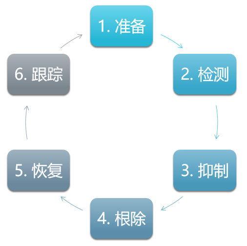 该模型是国际上比较权威的处置网络安全事件的应急响应方法论,分为准备(Preparation)、检测(Detection)、抑制(Containment)、根除(Eradication)、恢复(Recovery)以及跟踪(Follow-up)等六个阶段,并根据网络安全应急响应总体策略对每个阶段定义适当的目的,明确响应顺序和过程。