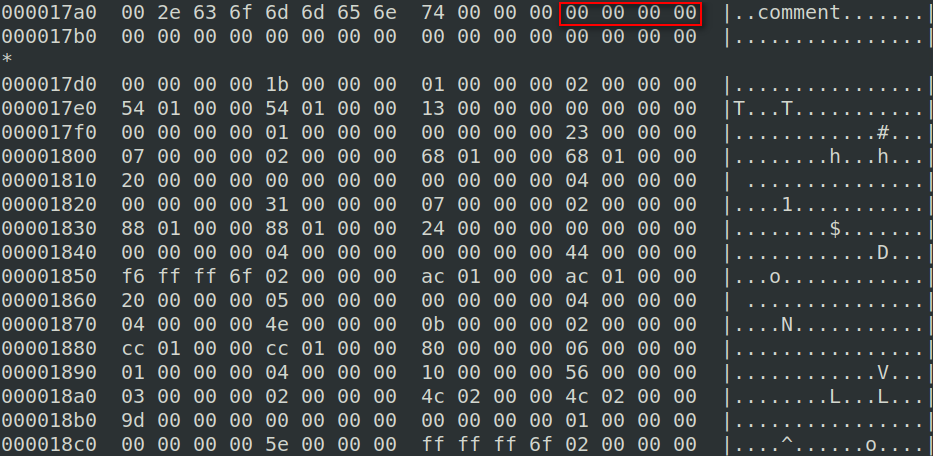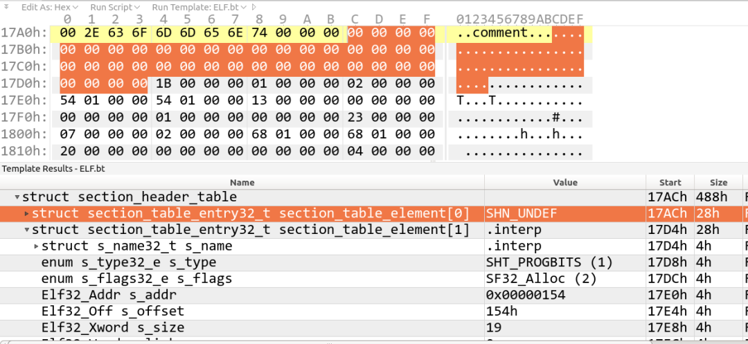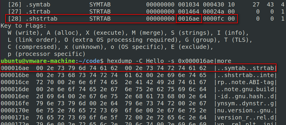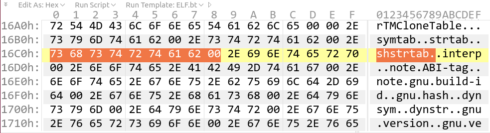 起始地址是000017ac,第一个段表项全0,sh_name在段表项中的偏移是 001b,由上图可以得到“.shstrtab”段的偏移是0016ae,