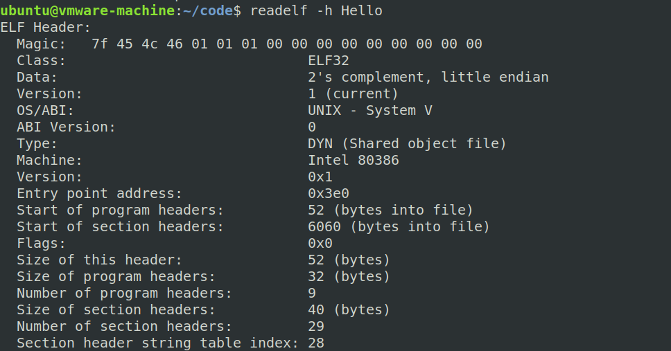 #define EI_NIDENT (16)typedef struct{unsigned char e_ident[EI_NIDENT]; /* Magic number and other info */Elf32_Half e_type; /* Object file type */Elf32_Half e_machine; /* Architecture */Elf32_Word e_version; /* Object file version */Elf32_Addr e_entry; /* Entry point virtual address */Elf32_Off e_phoff; /* Program header table file offset */Elf32_Off e_shoff; /* Section header table file offset */Elf32_Word e_flags; /* Processor-specific flags */Elf32_Half e_ehsize; /* ELF header size in bytes */Elf32_Half e_phentsize; /* Program header table entry size */Elf32_Half e_phnum; /* Program header table entry count */Elf32_Half e_shentsize; /* Section header table entry size */Elf32_Half e_shnum; /* Section header table entry count */Elf32_Half e_shstrndx; /* Section header string table index */} Elf32_Ehdr;