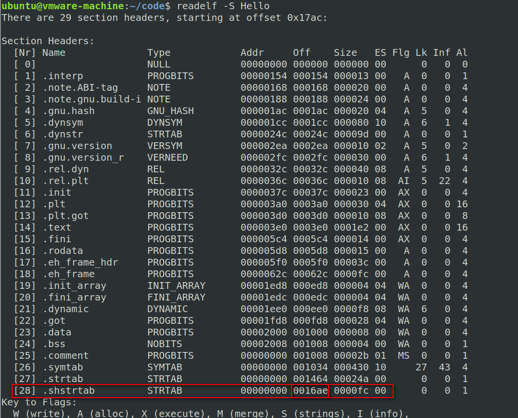 /* Section header. */typedef struct{Elf32_Word sh_name; /* Section name (string tbl index) */Elf32_Word sh_type; /* Section type */Elf32_Word sh_flags; /* Section flags */Elf32_Addr sh_addr; /* Section virtual addr at execution */Elf32_Off sh_offset; /* Section file offset */Elf32_Word sh_size; /* Section size in bytes */Elf32_Word sh_link; /* Link to another section */Elf32_Word sh_info; /* Additional section information */Elf32_Word sh_addralign; /* Section alignment */Elf32_Word sh_entsize; /* Entry size if section holds table */} Elf32_Shdr;