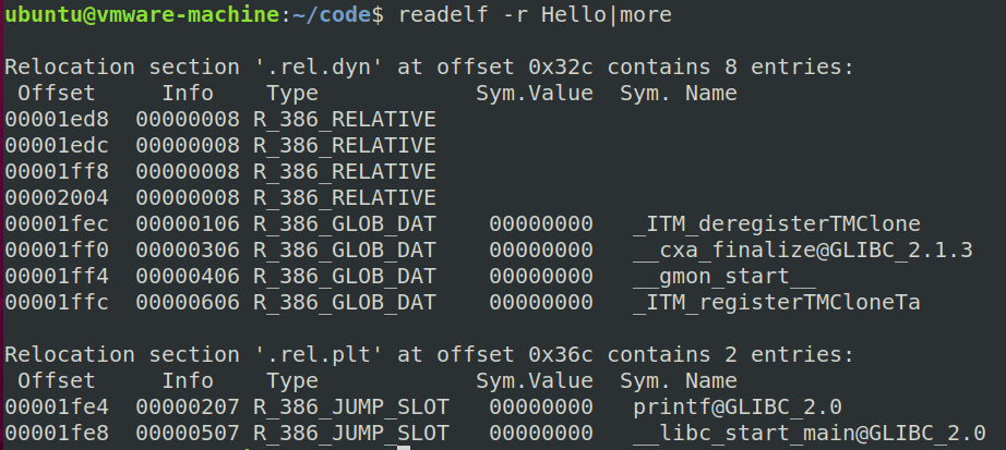 /* Relocation table entry without addend (in section of type SHT_REL). */typedef struct{Elf32_Addr r_offset; /* Address */Elf32_Word r_info; /* Relocation type and symbol index */} Elf32_Rel;