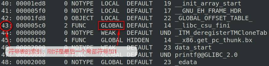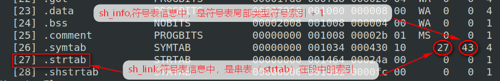 sh_info 记录的是符号表最后一个局部符号的符号表项在符号表内的索引加1,一般恰好是第一个全局符号的符号表项索引,这样可以帮助连接器更快的地定位到第一个全局符号。如下图:段中符号表段的信息sh_info,刚好是局部符号+1的索引。
