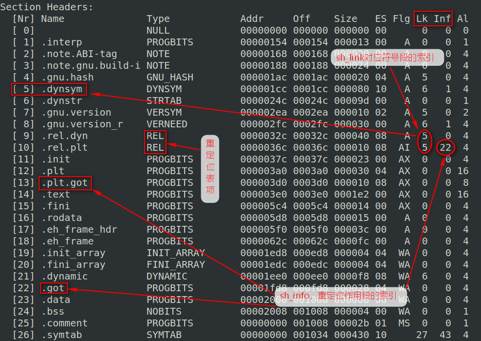 对于重定位表表段(段类型是SHT_REL),sh_link记录重定位所作用的符号表段表项早段内的索引,而sh_info记录重定位所作用的段对应的段表项在段表中的索引。