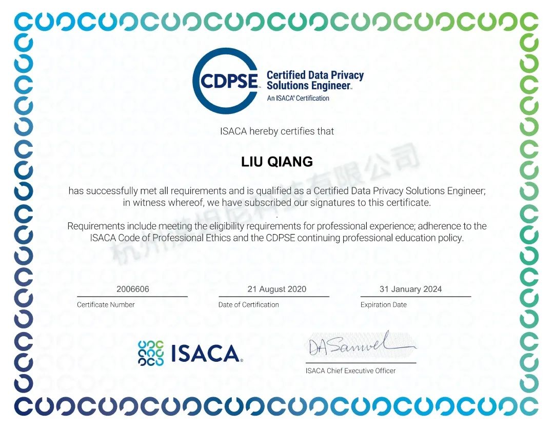 2020年8月21日,杭州漠坦尼科技有限公司数据安全专家刘强首批获得由ISACA(国际信息系统审计协会)认证的CDPSE(数据隐私解决方案工程师)证书。这标志着公司在隐私治理、隐私架构、数据生命周期三个领域的数据安全服务能力得到了更进一步的认可。