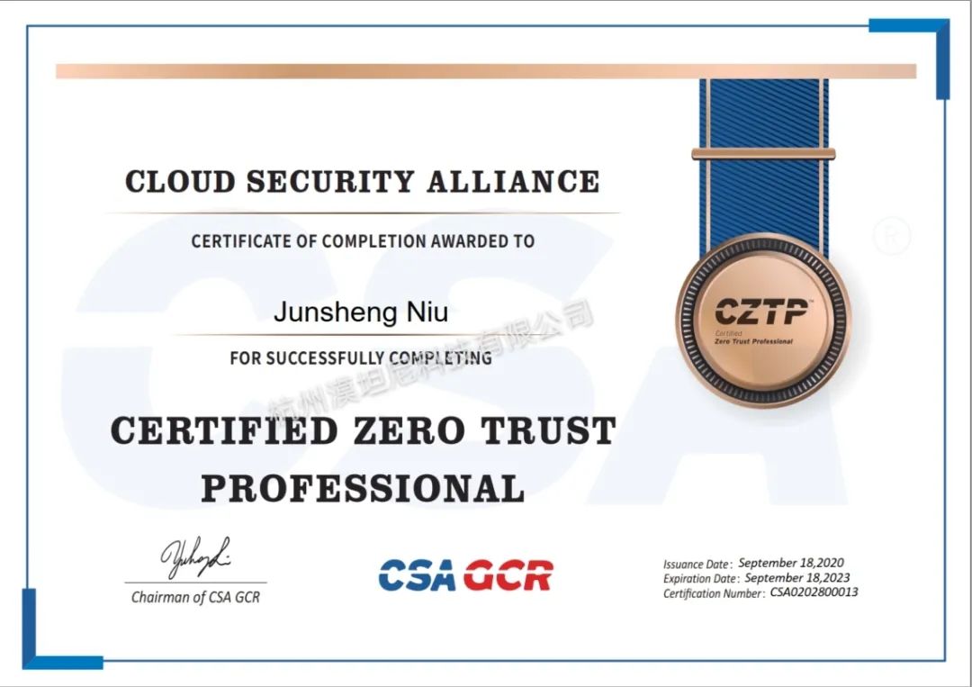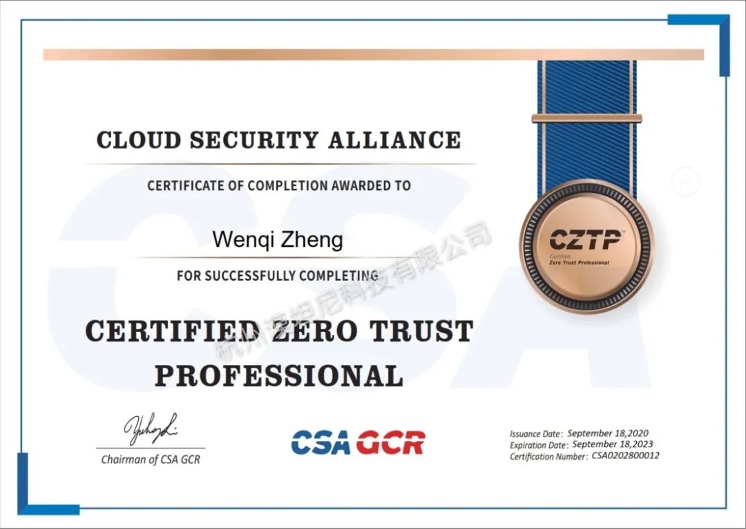 2020年9月18日,漠坦尼公司零信任专家郑文奇、刘强、牛俊生获得由CSA.GCR(云安全联盟大中华区)认证的全球首批CZTP(零信任专家认证)。这标志着漠坦尼在零信任战略规划、技术实现、落地实践等方面能力得到了更进一步的认可。
