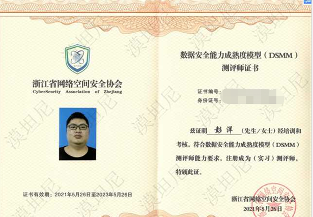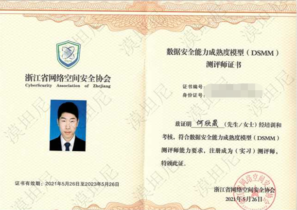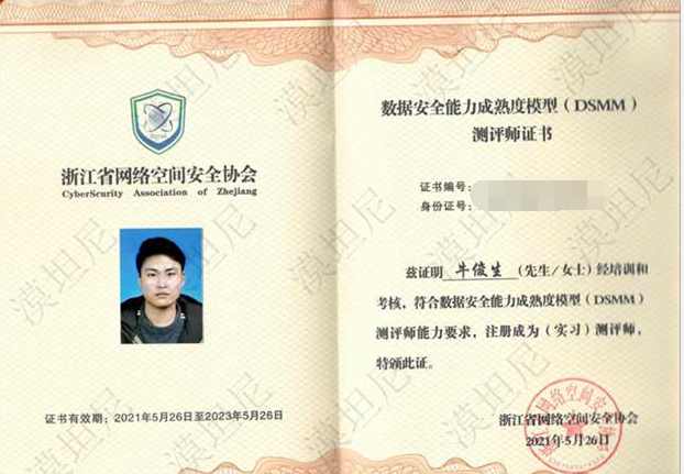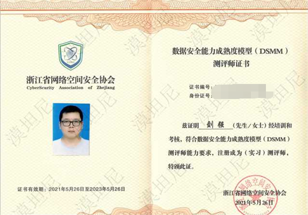 近日,我司刘强、彭洋、何欣晟、牛俊生获得由浙江省网络空间安全协会认证的数据安全能力成熟度模型(DSMM)测评师证书。这标志着漠坦尼科技在数据安全、技术实现、落地实践等方面能力得到了更进一步的提升和认可。