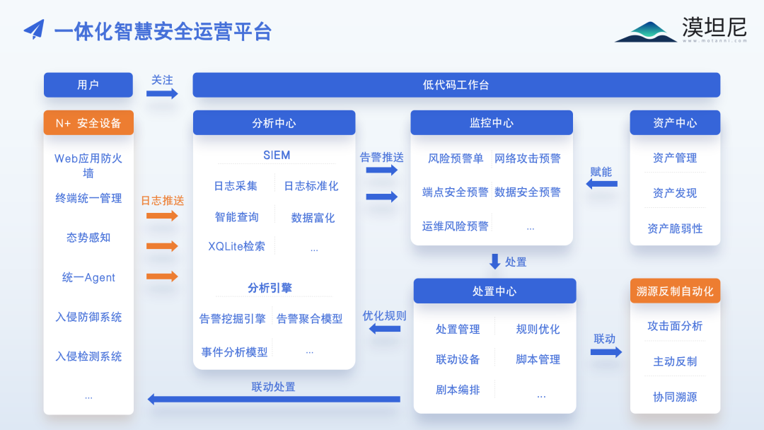 漠坦尼自主研发的一体化智慧安全运营平台,整合多点分散的安全能力和安全情报, 打通现有的安全设备、数据、流程和人员,把握全场景宏观态势;为用户提供聚合分析、监控预警、威胁验证、协同响应、溯源反制、智能运维等安全运营服务,协助用户实现安全能力和安全大数据的全网协同调度。