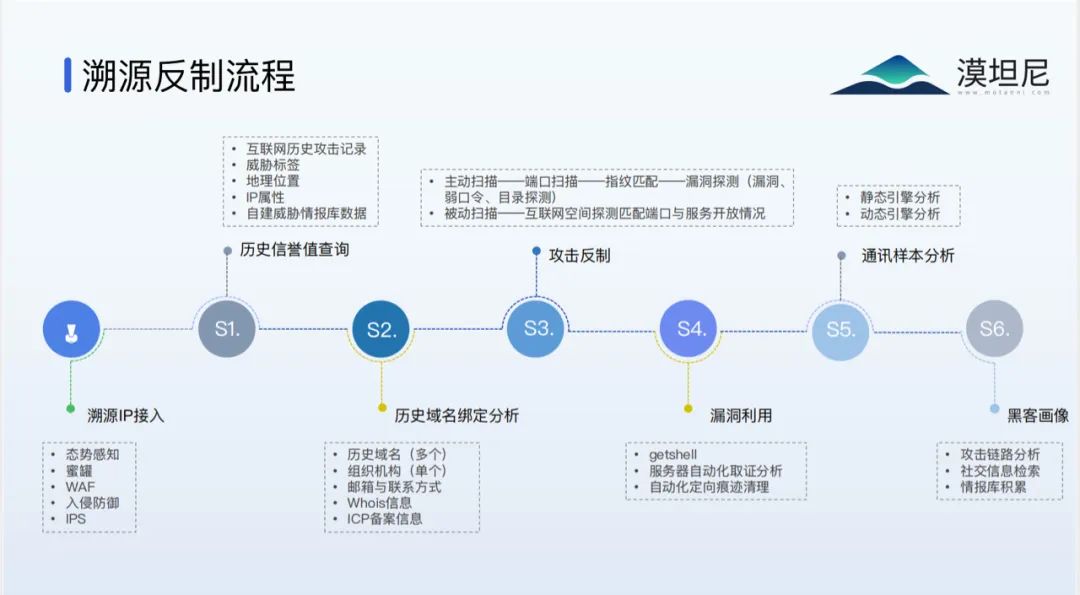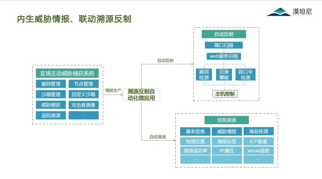 漠坦尼在参与了多年的实战攻防演练中,针对性的研发的“溯源反制自动化工具”,和“玄境主动威胁捕获系统” 帮助各位蓝队优化溯源中一些机械式操作,将溯源反制一系列操作流程化、自动化,大大加强了蓝队溯源反制效率。
