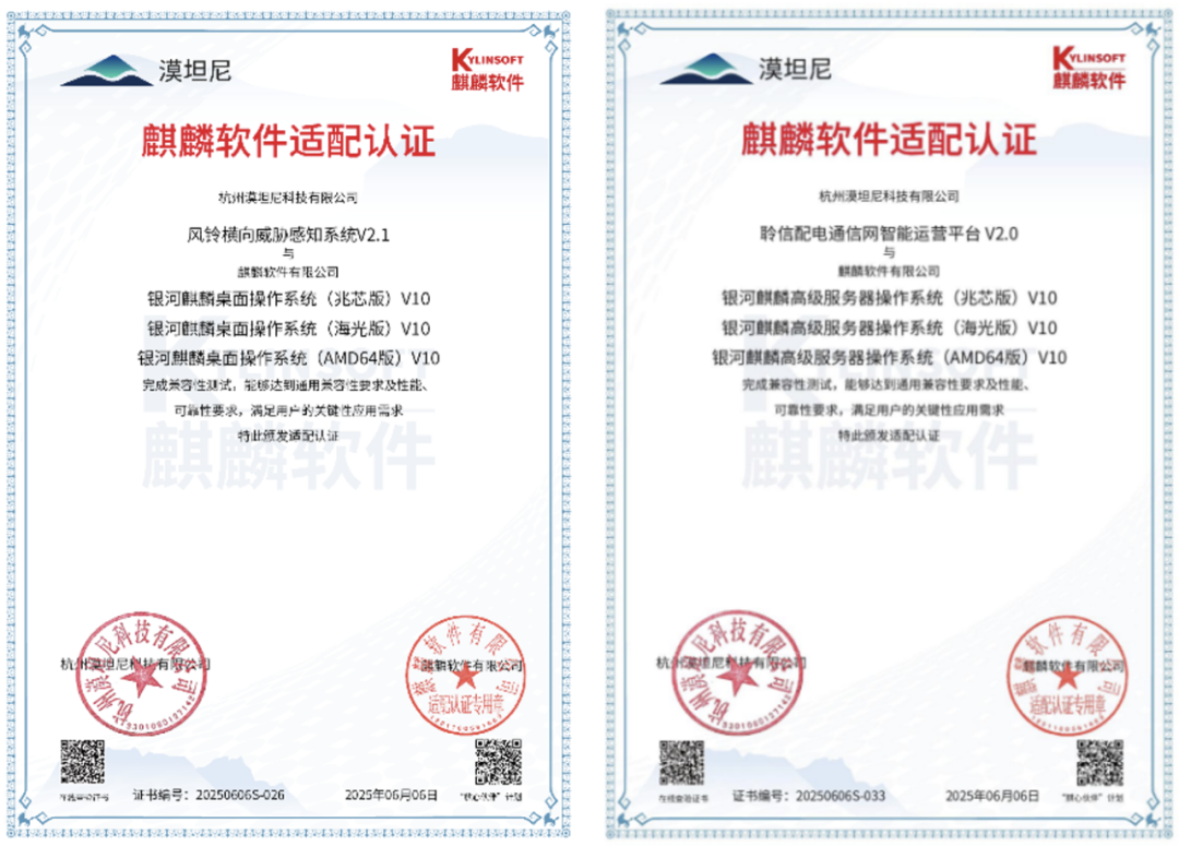 近日,漠坦尼自主研发的两大核心产品 风铃横向威胁感知系统 与 聆信配电通信网智能运营平台 顺利通过麒麟软件适配认证!